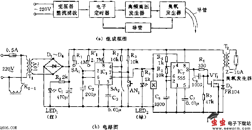 整机电路包括降压整流电路、电子定时电路、高频振荡高压电路、臭氧产生器及抗氧化压力气泵等,如图所示。