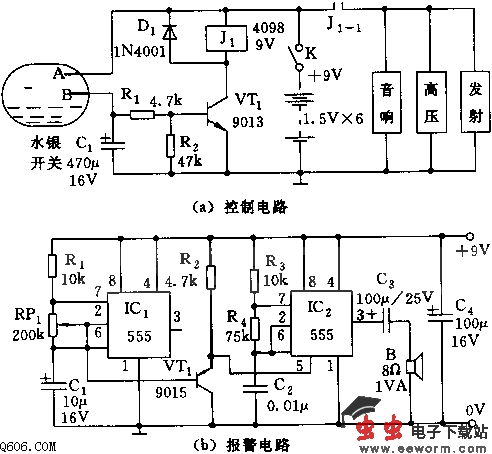 位置传感器用一支水银开关置于病人胸前衣袋盒内,水平放置。当跌倒时,A、B两接点被导电的水银接通,C1迅即充电,VT1导通,J1吸合,将音响电路的电源接通,于是响起呼救音响。