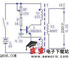V选用3DD59A,R用1/4W的普通电阻,C选用0.22μF/50V,变压器需自制,N1、N2绕组用?0.9mm的漆包线,N3绕组用0.67mm的漆包线,绕组框架可用1mm厚的硬纸板制作,磁芯最好用铁氧体U型或环型,如没有,就用普通E型或F型硅钢片代替,直流电流G用6V蓄电池。
