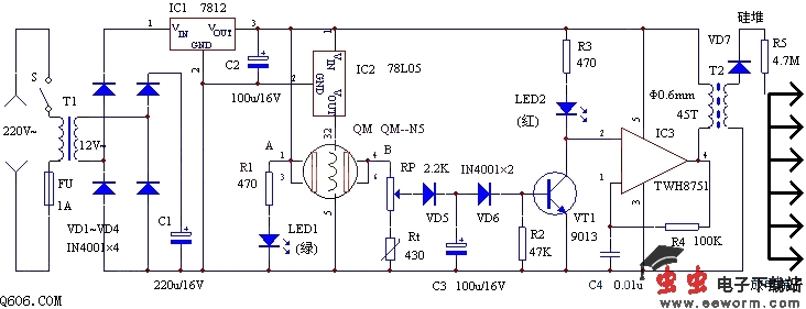 元器件清单如下。 编号 名称 型号 数量 R1、R3 电阻 470Ω 1/8W 2 R2 电阻 47K 1/8W 1 R4 电阻 100K 1/8W 1 R5 电阻 4.7M 1W 1 RP 可调电阻 2.2K 1 Rt 热敏电阻 430Ω 负温度系数 1 C1 电解电容 220V/16V 1 C2、C3 电解电容 100u/16V 2 C4 涤纶电容 0.01u 1 VD1-VD6 整流二极管 IN4001 6 VD7 硅堆 18kV 1 LED1、LED2 发光二极管绿、红 2 IC1 三端稳压IC LM7812 1 IC2 三端稳压IC 78L05 1 IC3 功率开关IC TWH8751 1 QM 气敏元件 QM-N5 1 S 开关钮子开关 1 FU 保险管 1A 1 T1 电源变压器 12V 15W 1 T2 高频变压器自制 1 T2用14吋行输出变压器改制,其高压包不动,将低压绕组线圈全部拆除,用Φ=0.6mm漆包线重绕45匝。其它元器件无特殊要求。放电端子用大头针做成,在长170mm、宽40mm的敷铜板上钻三排眼,每排16个,均为Φ=1mm。将大头针一一插入孔中并焊牢,要使焊点圆滑,不能有毛刺。挑选大头针时要注意长短一致,且尖头越尖越好。整机装入一个180×110×80(mm3)的ABS工程塑料盒中。