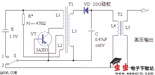 E采用一节5号电池。VT采用锗三极管3AX81,以改善低电压下的压降特性,如用硅管则压降较大,工作效率明显降低。VD采用2DG系列高压硅粒,其反压要求大于250V,C的容量在0.47—0.68uF范围,耐压大于160V。T1可用小型半导体收音机中的输入或输出变压器的E型5×7铁芯,L1用Φ0.17mm高强度漆包线绕30匝,L2用同样线径的漆包线绕60匝,L3采用Φ0.06mm的高强度漆包线绕3500匝。T2采用40mm长的磁棒作铁芯,首先用Φ0.41mm的漆包线在磁棒上绕17匝作L4,然后在L4上套入塑料槽骨架,并用Φ0.06mm的高强度漆包线在骨架上绕1500匝。骨架上共分线槽10个,每个线槽内绕150匝,可有效防止高压击穿L5自身。