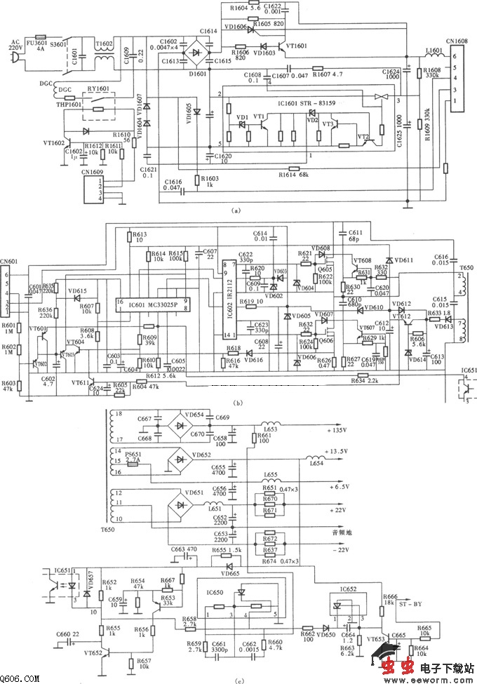 (a)是电源振荡部分;(b)是稳压部分;(c)是输出部分。