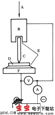 ,C—金属针极,D—钙钛矿型氧化物薄片,E—银或碳基导电浆料,F—金属衬底,G—