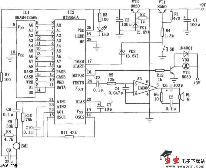 HT8656录放语音集成电路的内部有一个声音自动检测电路,当电路处于等待状态、传声器接收到声音信号时,电路便自动进入录音状态;而当声音停止(或静音)约1s时,电路便自动由录音状态转为放音状态,放音结束后又会自动回到等待状态。它多用于声控学话玩具、工艺品等。其典型应用电路如图所示。