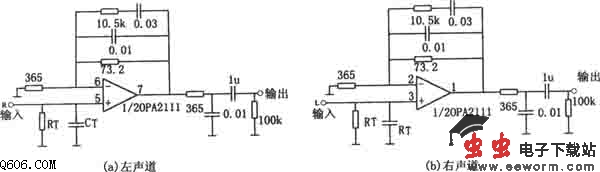 OPA2111构成的均衡立体声前置放大电路图
