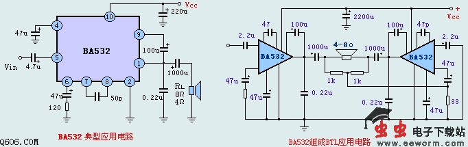 在电源电压为13.8V时,8Ω负载阻抗,THD=10%时,输出功率可达5.8W,纹波抑制比高达40dB,引脚与BA511A、BA521相同。常用于汽车立体声收录音机,收音机、电视机和磁带录音机中作功率输出电路。