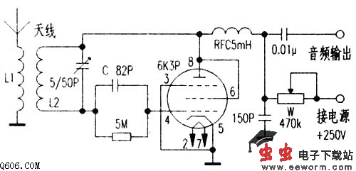 本机电路如图所示,是一个超再生接收机电路。由于多数频道频率工作在88MHz~108MHz范围,以上海文艺频道(中间频率96.8MHz)为参考点,L2用Φ2mm镀银铜线,在外径Φ15mm模具上以圈间距为2mm绕制5匝成空心式,L1用(Φ2mm镀银铜线在L2外套绕2匝,圈与圈之间的距离为2mm。两个线圈之间的距离约2mm至3mm。高频阻流圈用Φ0.32mm漆包线,在直径10mm纸管上分三段蜂房密绕150匝,段距2mm。天线用一米长的拖线即可。电子管选用J级6K3P或6K4,也可选用6J1,但其增益稳定性不及6K3P及6K4(变μ管)。