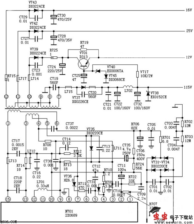 300V直流电压经R707、R724分压后,再由C735、L701加到N701的(12)脚,IX0689的(12)脚是内部开关管的B极,于是开关管开始导通,电流从(15)脚C极流入,从(13)脚E极流出,经R714、R710到热地。