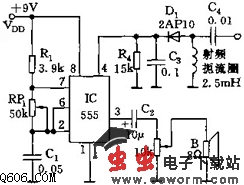 如图所示,555和R1、RP1、C1等组成可控音频振荡器,f=1.44/(R1+2RP1)C1,图示参数的频率在600Hz~20kHz之间,可通过调节RP1来选定。