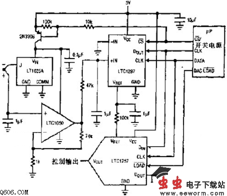 如图所示的是热电偶AD转换电路,电路为5V单电源12位冷端补偿式具有关断功能的温度控制系统电路。用J型热电偶进行温度监测。LT1025A为热电偶冷端补偿电路,LTC1050为斩波运算放大器,起放大信号作用。47k欧、1uF构成的RC网络在信号进入A/D变换器前起滤除噪声作用。LT1297为A/D变换器,LTC1257的输出用于系统监视时的温度控制信号。