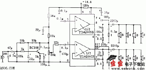 如图示出的是20w公共汽车收音机和扩音机电路,是采用TDA2005S双低频功率放大集成电路的公共汽车收音和扩音电路。图中输入端可以接话筒或收音机的低频电压放大输出级。每个TDA2005S输出10W功率,可带4个扬声器。两路输出可带8个扬声器,可分放在车内不同地点。总共输出功率可达20W。