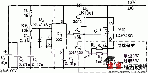 555输出的脉冲序列经限流电阻R3加至VT1的控制极G,VT1采用N沟道声场效应功率晶体管,控制极的低开关频率信号的驱动,使FET管产生一种PWM(脉宽调制)的效应,这样就使汽车的直流灯处于低开关频率工作状态,效率高,使用寿命延长。