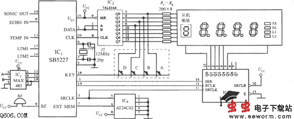 如图所示的是智能化超声波测距仪电路,由SB5227构成。图中省略了发送电路、接收电路及温度检测电路。图中使用了5片集成电路:IC1(SB5227AM或SB5227AS);IC2(8位并行输出的串行移位寄存器74LS164);IC3(带输出锁存的8位串行移位寄存器74LS595);IC4(基于I2C总线的2Kb E2PROM存储器AT24C02);IC5(RS-485总线驱动器 MAX485)。在AT24C02中存储着所设定的参数,当突然断电时可防止数据丢失。LED显示器由5位共阴极数码管构成,最高位(万位)用来显示从机地址(ADDR),其余4位显示测量值,亦可显示出距离的上、下限。LED显示器以动态扫描方式工作。