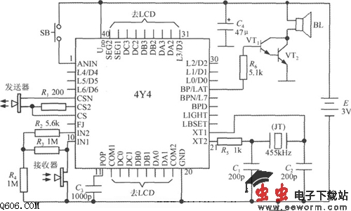 如图所示是智能液晶显示超声波测距仪电路,由4Y4构成单片液晶显示测距仪。该仪表主要包括超声波发送器、接收器、LCD显示器、按钮开关和蜂鸣器(或扬声器),为了简化引线,4Y4直接焊在LCD显示板的背面。4Y4的第2~4脚、第8脚、第23~26脚和第28~30脚不用。R1为发送电路的限流电阻。R2~R4为接收放大器的外部元件。C3为开机自动复位电容。晶振电路采用廉价的455kHz压电陶瓷滤波器来代替石英晶体(JT),C1和C2为振荡电容。SB为按钮开关。C4为电源退耦电容。4Y4只能驱动压电陶瓷蜂鸣器或微型讯响器,为了驱动扬声器,还需要增加~级达林顿管(VT1、VT2)作为功率放大使用。R6为VT1的限流电阻。