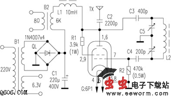 L1选用22mm的漆包线在MX-2000的磁环上绕100匝。L2决定电台的发射频率。如果频率选在中波波段时,L2可选用35mm的漆包线在中波磁棒上30 +50匝,或选用13mm的漆包线在25mm的纸筒上密绕90匝。这样发射频率会落在550-1650kHz之间。如果选用短波波段时,L2可用 0.5mm的漆包线在16mm的纸筒上间绕9匝。这样构成的振荡器频率就落在6~18MHz之间。C5为空气双联,其容量为360pFx2。B1为原机电源变压器。高压部分整流改用4只IN4007。B2为原输出变压器。C2、C3、以为机内拆得的云母电容,其中C2、C3耐压以大于400V为佳。R1、 R2也可自己购水泥电阻。因牦散功率较大,其功率选≥IW。TX为1/4天线,可用一段粗导线代替,‘长度约为发射波长的1/4。笔者选用的是3mm、 8m长的漆包线。整个电路安装无需使用敷铜板,直接用一块胶木板,在其上钻.孔,搭棚焊接即可。只要元件良好,装好后电路即会起振,起振时G内能看到浅蓝色的电子流,并伴有“咝咝”的声音。如果有条件,可做一个简单的场强仪,通过调节R2使发射场强达到最大。天线可通过绝缘子垂直安装在墙上。接上天线后在 B2处输入5W左右的音频信号,将一个收音机和发射机的距离拉远,收音机应能清晰地收到信号,失真度也不应很明显。若发射时交流声太大,接地便能解决。经实测,发射功率有4.5W。