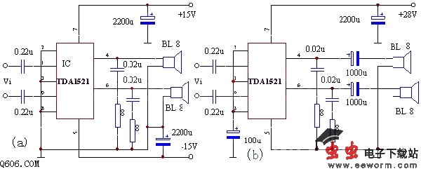 如图所示的是用高保真功放IC TDA1521A制作功放电路,具有外围元件少,不用调试,一装就响的特点。适合自制,用于随身听功率接续,或用于改造低档电脑有源音箱。
