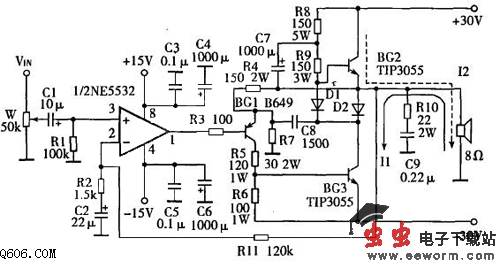 这是一种带自举作用的新颖ocL功放电路,其电路原理如附图所示。电路主体由靓声运~NE5532与末级的两只TIP3055~ 。BG1、P.4、R5、P.6、P.7组成推动级,增益由R4/R7决定。BG2、BG3、D1、D2、P.8、R.9、C7组成新甲类输出。该电路的特点是在静态时,输出管施加一定的偏压,使其处于甲类偏置状态;当有交流信号输入时,输出管对于交流信号而言又在乙类状态工作。这种电路的特点是不仅失真小,而目输出功率大,效率也较高。