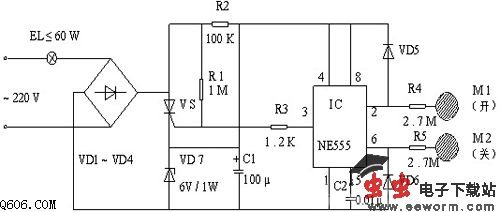 VS与VD7构成了开关回路。当人触摸到M1(开)电极片时,人体通过R4、VD5整流后给IC NE555集成电路的2脚一个低电平信号(此时IC NE555集成电路接为RS触发器),输出脚3输出高电平,通过R3后触发VS的门极,VS导通,电灯点亮。
