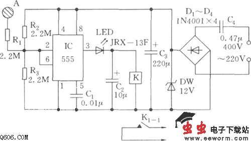如图所示是触摸感应开关电路图,该电路由降压整流电路和555触发器组成。当手触及金属片A时,感应信号就使555内部的比较器翻转置位,K吸合,触点K1-1闭合;若再触发一下A,则K释放,K1-1断开。