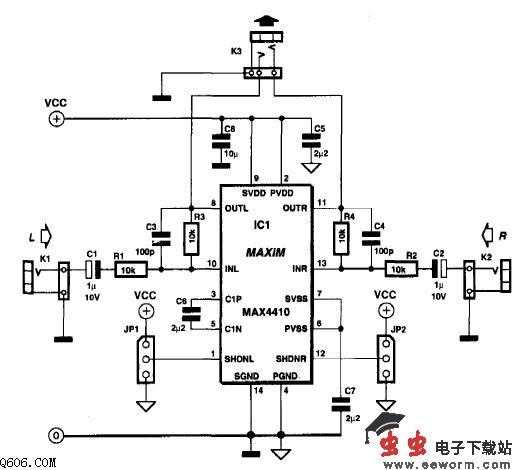 两路立体声每个声道均可以借助断开跳线JP1和2独立关断。正常工作时JP1和JP2与电源相连。如果两个声道同时关断。则供给泵就自动切断。这时电流消耗仅有6uA左右,非常省电。
