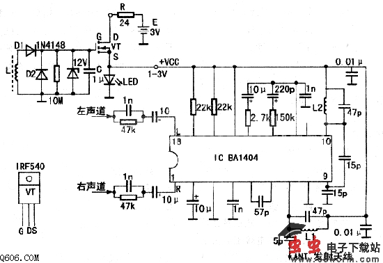 为使电路,gU-简单而不增加太多成本,电子开关是由场效应管VT担任。因为场效应管所需驱动功率极小。基本不要驱动电流。由磁棒线圈L吸收开电视机而产生在电视机周围的电磁场的能量.经D1、D2倍压整流.在电容C上积累一定电量,当电压逐步提高到场效应管VT的开启电压(约2V以上1.场效应管导通,3V电源通过限流电阻R,VT为转播系统供电。