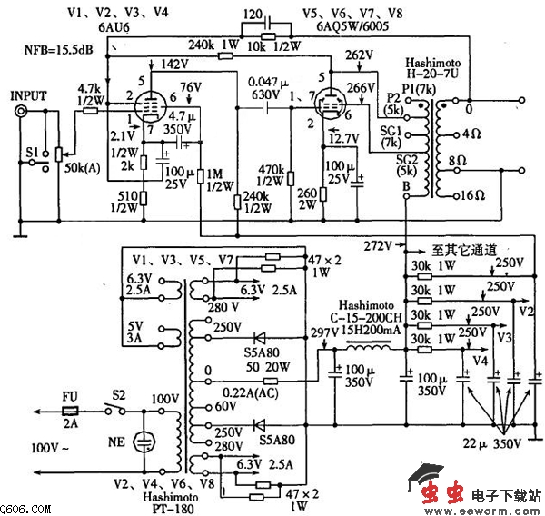 6AQ5W/6005UL单端四声道放大器电路原理如图所示。图中仅画出—个声道。4个声道统—使用一只电源变压器供电压放大部分使用东京光音的4CP-2508-SA型4连音量电位器,同时调整4个声道音量。输出级采用听感较好的UL型电路。 NFB回路分两路,一路是由输出管的屏极经240kQ电阻到初级管的阴极,反馈量为6dB,另一路取自于输出变压器次级81"1处,反馈量为9.5dB。