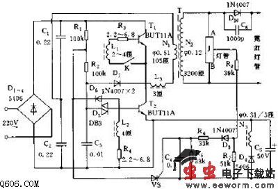 电路原理:当输出端开路时,A、B两点向灯管J放电,放电电场使VS获得触发信号而导通,即C1被接地,电路停振,达到保护的目的。平时N3向VS阴极提供一个10V左右的负压,在负载开路时,负压突然升高,加速了VS导通,D6的作用是在VS导通时使T2基极同时接地,加速了T2截止,使保护快而可靠。由于VS触发极平时无工作电压,所以避免了误保护,增强了抗干扰能力。常闭温度开关K用于过流保护,其工作温度选择在65~70摄氏度为宜,并将其紧靠T1或T2安装。在接入负载太重或工作过程中部分灯管断裂时开路,过压保护不起作用,但T1、T2却因过流而发热。当温度升高到设定极限时,K开路,电路停止工作,保护功率管不至损坏,灯管J是一个有辅助电极的放电管。平时J不放电、遇到霓虹灯管开路时,升压变压器次级电压突然升高,则J会产生放电,保护了霓虹灯电源电路。