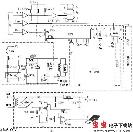 8031单片机的Rxd、Txd、P1.7通过74LS06集电极开路的OC门实现电平转换,并同后续的CMOS器件连接。A、B、C三相交流电的过零信号产生电路产生的过零触发信号a、b、c,并将其连通到每块功率驱动板上3片4094的STR脚上(a1、b1、c1),使负载在每相交流电压过零点触发。功率驱动单元电路采用光电隔离,消除外来干扰,提高系统工作可靠性。光耦输出首先驱动可控硅SCR1,再由SCR1驱动SCR2.电路中的发光LED用于编程调试时模拟显示;由电阻-电容构成的RC吸收电路用于吸收霓虹灯关断时因变压器为感性负载而产生较大的反向冲击电流,确保功率驱动顺利实现。