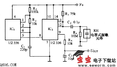 ,主要产生触发IC2的脉冲。ICz和电容型湿敏元件及外围元件组成可调宽的脉冲