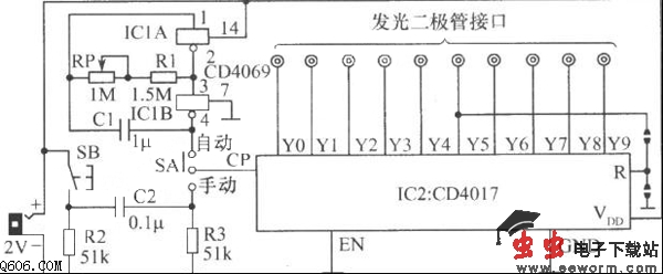 如图所示为彩灯信号源产生电路图,电路由CD4017组成。