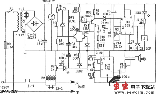过压、欠压和过流检测、开关电路由W1、R2、R3、DW1、BG1、BG2、BG3等组成。当发生过压、欠压或过流时,BG3截止,其集电极为高电位,该电位的一路加至IC1⑥脚,使555复位,③脚输出的低电平使继电器J释放,触点J2-2断开,切断冰箱电源,同时LED1被点亮;另一路则通过R10、R1分压后加至IC2④脚,使IC2起振。