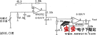 如图所示为低噪声高保真RIA前置放大电路。该电路使用了一片超低噪声精密运放OPA37E和一片介质隔离场效应管输入型宽带运放OPA606。 OPA37E运放作为低噪声前置放大,输入信号由电磁式拾音器取得,并送入OPA37E的同相输入端(引脚3),与电磁式拾音器配合的负载R和C(图中电阻为47.5kΩ,电容为150pF)的数值应与拾音器匹配,其大小可选用拾音器厂家推荐的数据。引脚6、2之间的阻值为2.49kΩ的电阻为反馈电阻,它与阻值为49.9Ω的电阻构成前置级电压串联负反馈,因而OPA37E放大电路的电压放大倍数为Av1=(1+2.49kΩ/49.9Ω)=51倍,0PA37E的输出电压由引脚6送出,并经阻容网络(电阻为7.32kΩ、1.05kΩ,电容为0.1μF、0.3μF)组成双时常数电路,用以改善频率特性,该网络对音频信号将引入一定的衰减。
