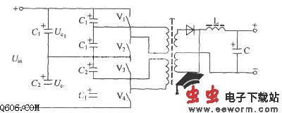 的最大耐压值仅为Uc1或Uc2值,如果C1=C2,则Uc1=Uc2=Uin/2值,因此可以选择降低耐压的开关管。另外V1、V2、V3、V4可以采用多管并联方式工作,增大输出电流的容量;对于变压器T可以工作在正反方向,大大地提高了变压器效率。鉴于上述优点,该电路得到了较广泛的应用,特别是在高电压输入和大功率输出的场合,其应用越来越普遍。