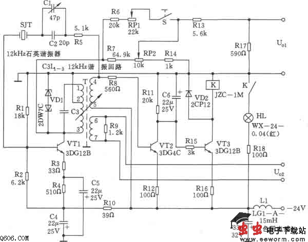 如图所示的12kHz中频振荡器由12kHz石英振荡器、输出电平调整、电平提升电路以及告警电路所组成。它采用新颖单管调谐变量器反馈式振荡电路,在反馈回路中,串接了12kHz石英晶体谐振器,从而使振荡频率取决于l2kHz石英晶体谐振器的性能。在提高振荡器可靠性及输出幅度稳定性方面,采用了交流稳幅电路,在其它方面,本电路尽量采用性能稳定可靠性较高的器件,简化电路,以便得到优良的性能。