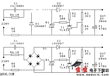 该电源可以短路. 如果能保证电容C1接在火线上,可以用手摸,本来这个电源是给人不接触的小电器提供的,只要无极性电容C1耐压够,长期使用没问题,从原理上讲,这是一个输入电压为220V的并联稳压电路,电压降在C1上,如果输出电流要大,可以增大C1的容量,我曾经增大到2UF,可以正常使用.也试验过4UF,在拔插插头时,火花太大,就没再使用. 我用的是图1,可控硅和431都没损坏,实际上由于E1是C1的470倍,即使在接通的瞬间是交流的峰值300多伏,在E1上也不会有高压. 功率很好计算,1UF的电容,对50HZ的容抗是3.15k,输出电流估算:200V/3000欧姆,电流约60MA,如果半波整流,电流只有一半.约30MA 。