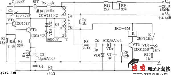 如图所示电路由l2kHz中频振荡器,告警电路组成。它采用变量器反馈式振荡电路,其振荡频率主要由石英晶体决定。Cl、C2可以作微调频率。振荡管采用复合管以提高输入阻抗,幅度的稳定由VDl、VD2双向稳压得到。