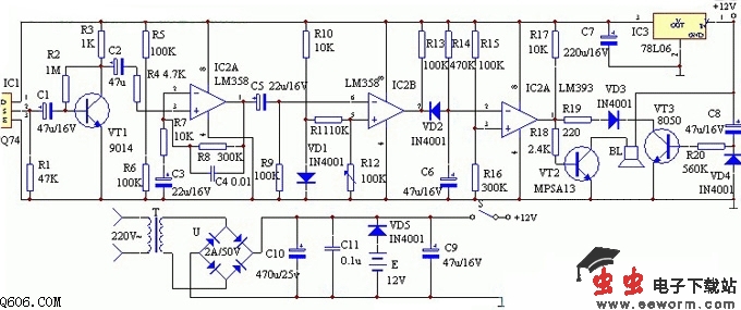 报警器是利用探测人体发出的红外线由红外线传感器、信号放大电路、电压比较器、延时电路和音频报警电路等组成。红外线探测传感器IC1探测到前方人体辐射出的红外线信号时,由IC1的2脚输出微弱的电信号,经三极管VT1等组成第一级放大电路放大,再通过C2输入到运算放大器IC2中进行高增益、低噪声放大,此时由IC2 1脚输出的信号已足够强。IC3作电压比较器,它的第5脚由R10、VD1提供基准电压,当IC2 1脚输出的信号电压到达IC3的6脚时,两个输入端的电压进行比较,此时IC3的7脚由原来的高电平变为低电平。IC4为报警延时电路,R14和C6组成延时电路,其时间约为1分钟。当IC3的7脚变为低电平时,C6通过VD2放电,此时IC4的2脚变为低电平,它与IC4的3脚基准电压进行比较,当它低于其基准电压时,IC4的1脚变为高电平,VT2导通,讯响器BL通电发出报警声。人体的红外线信号消失后,IC3的7脚又恢复高电平输出,此时VD2截止。由于C6两端的电压不能突变,故通过R14向C6缓慢充电,当C6两端的电压高于其基准电压时,IC4的1脚才变为低电平,时间约为1分钟,即持续1分钟报警。