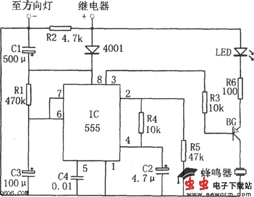 本电路实现在司机忘记关方向灯时,提醒司机及时关掉电源。