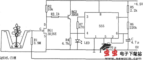 当花盆中不缺水时,A、B间电阻较小,BG1的栅极G到电路地的电压接近于0V,使N沟道结型场效应管BG1导通,相应BG2截止,其射极电位为0V,555因4脚为低电平而处于非触发状态,3脚输出低电平。