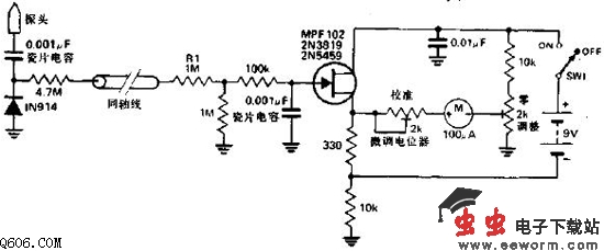 此电路提供了一个廉价而又可靠的测试齐纳二极管的方法。RV1可以按照伏特值来标定,使之当LED1刚刚亮的时候,引脚2和引脚3上的电压几乎相等。因此齐纳管电压可从RV1的位置直接读出来。所需电源电压只需等于被测齐纳管本身的电压。如果要做更精确的测量,可以附加一个精密的电位器来进行标定。