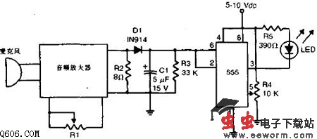 音响检测器主要由接成施密特触发器的IC555组成。只要输入超过某一电压,它的输出将改变状态,由高到低。R4用来设置门限电压。
