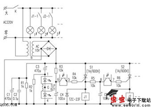 若想2#灯点亮,只需在1#灯点亮后的几秒钟,把电源开关K关掉后又立刻接通,则1#灯和2#灯均点亮,原因是开关K第一次接通后,电容器C1上已建立起了稳定的直流电压,该电压加在可控硅S1、S2的阳极上,此时开关第二次接通瞬间,光电耦合器因C3的耦合而短时间导通,可控硅S1即可触发导通,此时继电器J1工作,其触点J1-1接通,2#灯点亮。