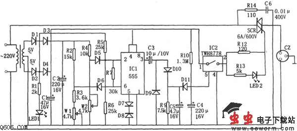 图中所示为全自动加电保护电路。该保护器由降压整流电路、过压和欠压检测电路、延时开关控制电路等组成。其中降压整流电路为整个电路提供直流电压。
