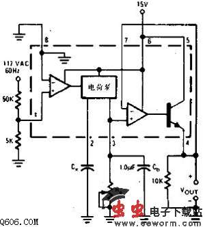 输出电压正比于连接到电荷泵引脚2上的电容量。该电容计工作覆盖范围是0.01~0.1uF(Ra调到111k欧)。在这个电容量程内,输出电压从1V到10V(电源电压为15V)。一个恒定的参考频率取自于60Hz市电。