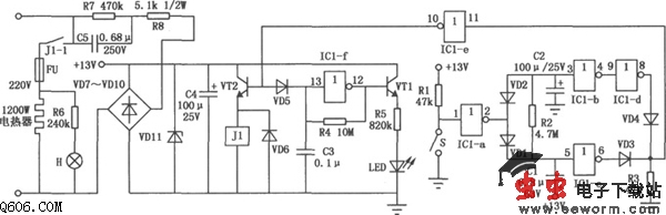 电路中的IC选用CD40106B,VT1用9014,VT2用N2222A,VD1~VD6选用1N4148,VD7~VD10选用1N4007,VD11用13V、1W稳压管,继电器J1选用12V、触点6A,LED不限。