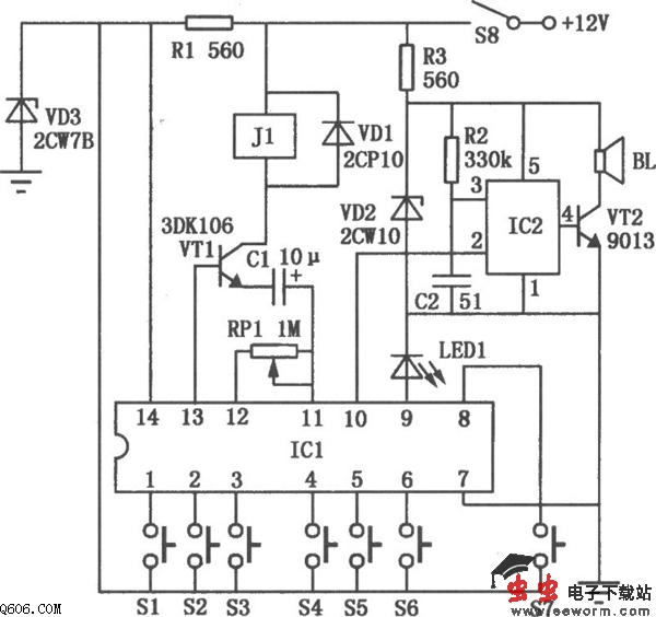 汽车电子密码锁的电路原理如图。ICl为专用密码锁集成电路5G058,它的1~6脚分别外接按键开关到电源正极,这是6个有效输入键,开锁必须遵照Sl~S6这一顺序;8脚所接按键开关S7是假键输入端,可以随意接一个或几个按键混插在键盘中以假乱真;9脚是按键指示端,每个按键连通期间都会使外接发光二极管LEDl发光,确认该键输入为有效;10脚是报警输出端,如果不是按Sl~S6顺序输入或超过有效开锁时间,则输出高电平,触发IC2防盗报警语言.有效开锁时间由电容C1与电位器RPl的大小来决定。