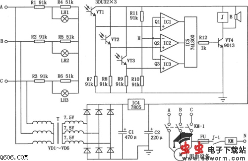 本电路为电压型光电传感式三相断路保护器,在电源缺相时会发出报警声,同时自动发出切断电源的指令。