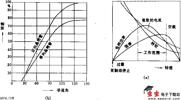 交直流通用电动机(整流电动机)中励磁绕组同电枢绕组串联,故在交流电源时,磁场方向和电枢电流方向同时改变,故旋转方向不变。图a示出其典型的特性曲线,图b示出电动机转速同导通角的关系曲线,图c为一稳速电路。控制角同触发回路中的RC环节上的电压有关,此电压为外加电压与电枢电压二者之差,故有负反馈稳定转速作用。