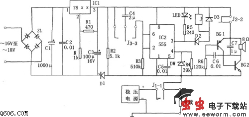 单稳延时电路由IC2(555)和R3、C4等组成。平时,常闭触点J1-1闭合,负载正常时使IC2④脚电位为高电平(1V以上),当负载短路时,555则因④脚电位为低电平(<0.6V)而被强制复位,③脚输出的低电平使继电器J吸合,触点J1-1断开,切断短路的负载。同时触点J2-2、J3-3分别接通,使由BG1、BG2、C6、C7、R6组成的音频反馈式振荡器因加上电压而振荡,其发出约lkHz的音响信号,以提醒使用者注意。触点J3-3接通后,C4通过R3进行充电,使IC②脚电位下降,当②脚电位降至低于1/3VDD时,555则发生置位。③脚输出的高电平使J释放,触点J1-1接通。若此时仍短路,则再进行保护。相应C4的充电时间即为555的延时保护时间td=1.1R3C4。保护时间长短可通过改变时间常数R3C4来进行调节。