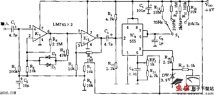 IC1、IC2采用LM741运算放大器,第一级用作放大,第二级为施密特触发器,对输入信号进行整形,使IC2的输出信号频率与输入信号的频率相同。与输入信号幅值无关。555和R12~R15、C5等组成单稳态触发电路,单稳态的暂稳持续时间按照输入信号频率的高低,选择不同的时间常数,或“档”,使555输出高电平的持续时间与输入信号的频率成正比,从而改变表头指针的偏转角度。DW稳压管作为斩波使用,使加到表头的脉冲幅值相同。